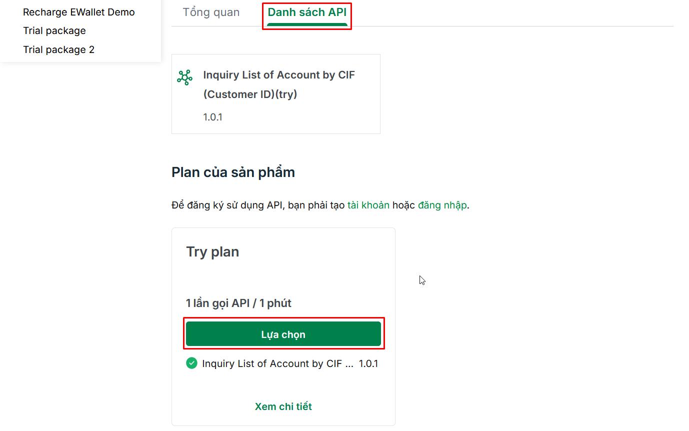 Chọn tab "Danh sách API" sau đó bấm "Lựa chọn" subscribe một Plan để truy cập